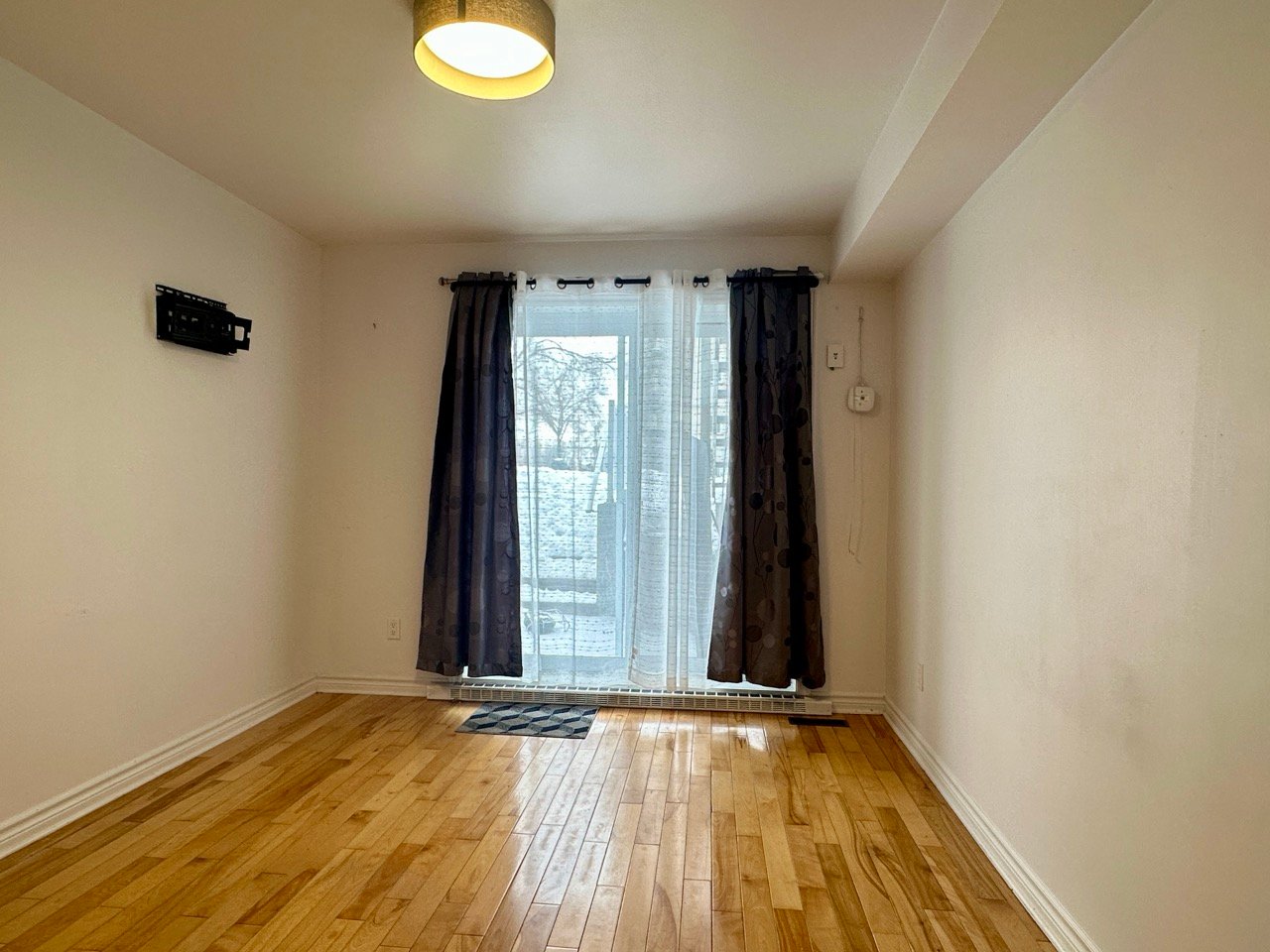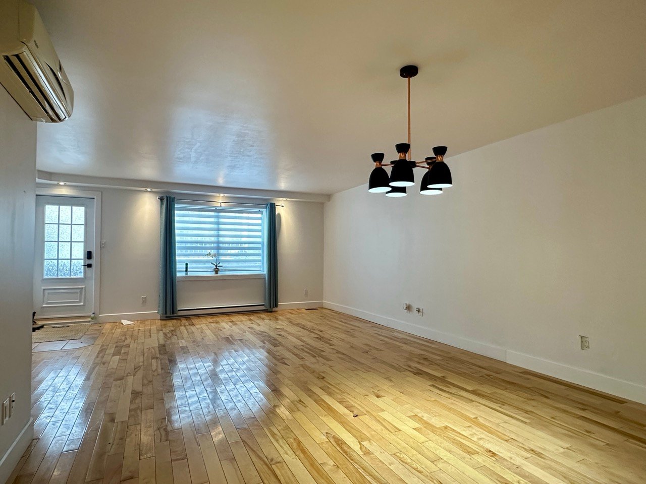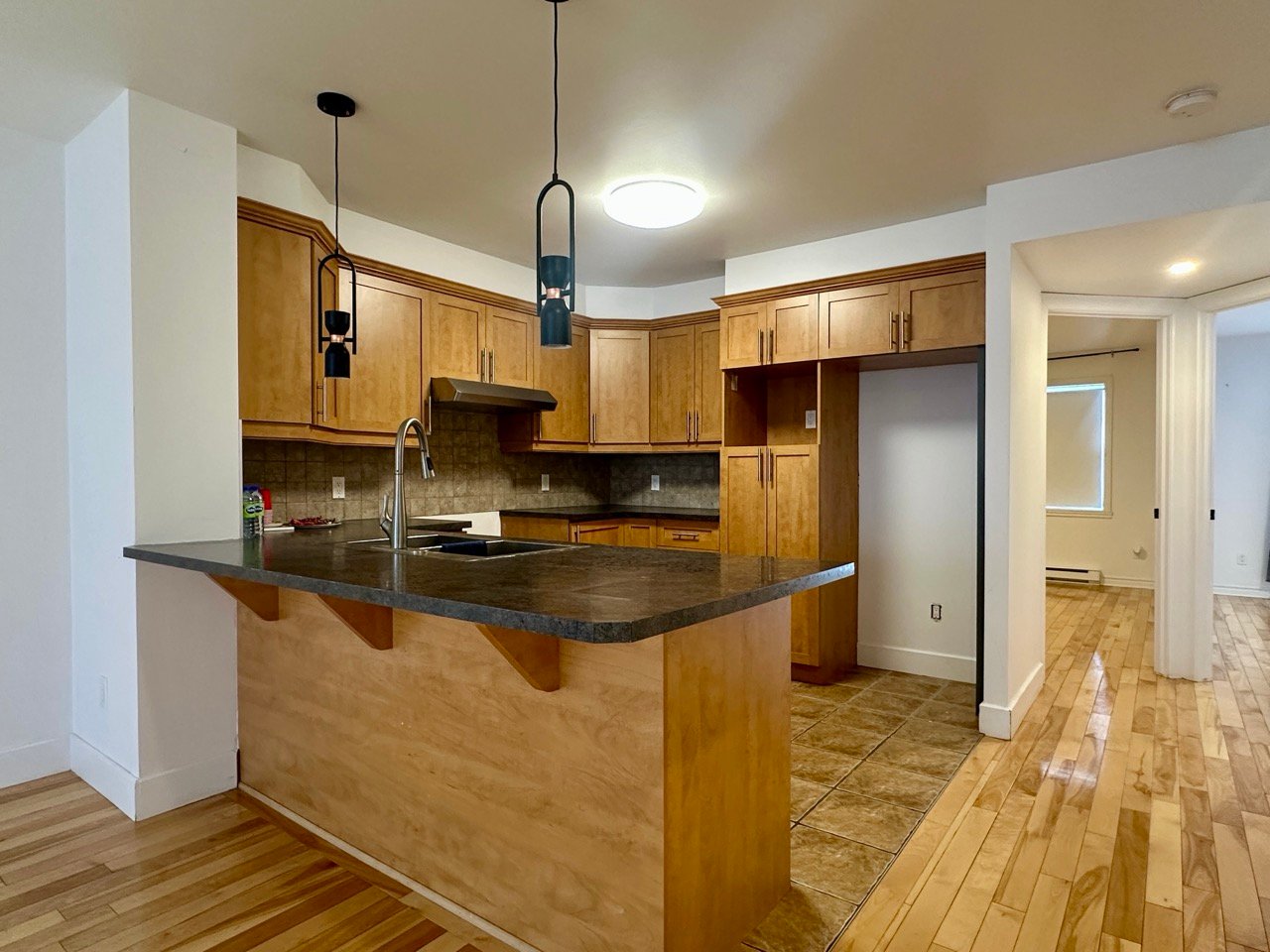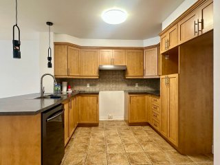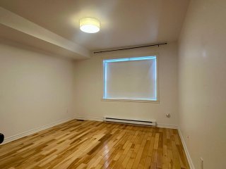 Unfurnished 1,100 sq. ft. condo in Pointe-aux-Trembles featuring a bright open-concept living space with hardwood floors and modern lighting. Functional kitchen with breakfast counter, wood cabinetry, and dishwasher. Separate laundry room. Primary bedroom with walk-in closet and outdoor access, plus a versatile second bedroom. Bathroom with glass shower and podium tub. Large private terrace, storage, and 2 outdoor parking spaces. Wall-mounted A/C and smart thermostats.