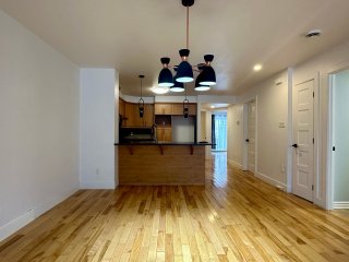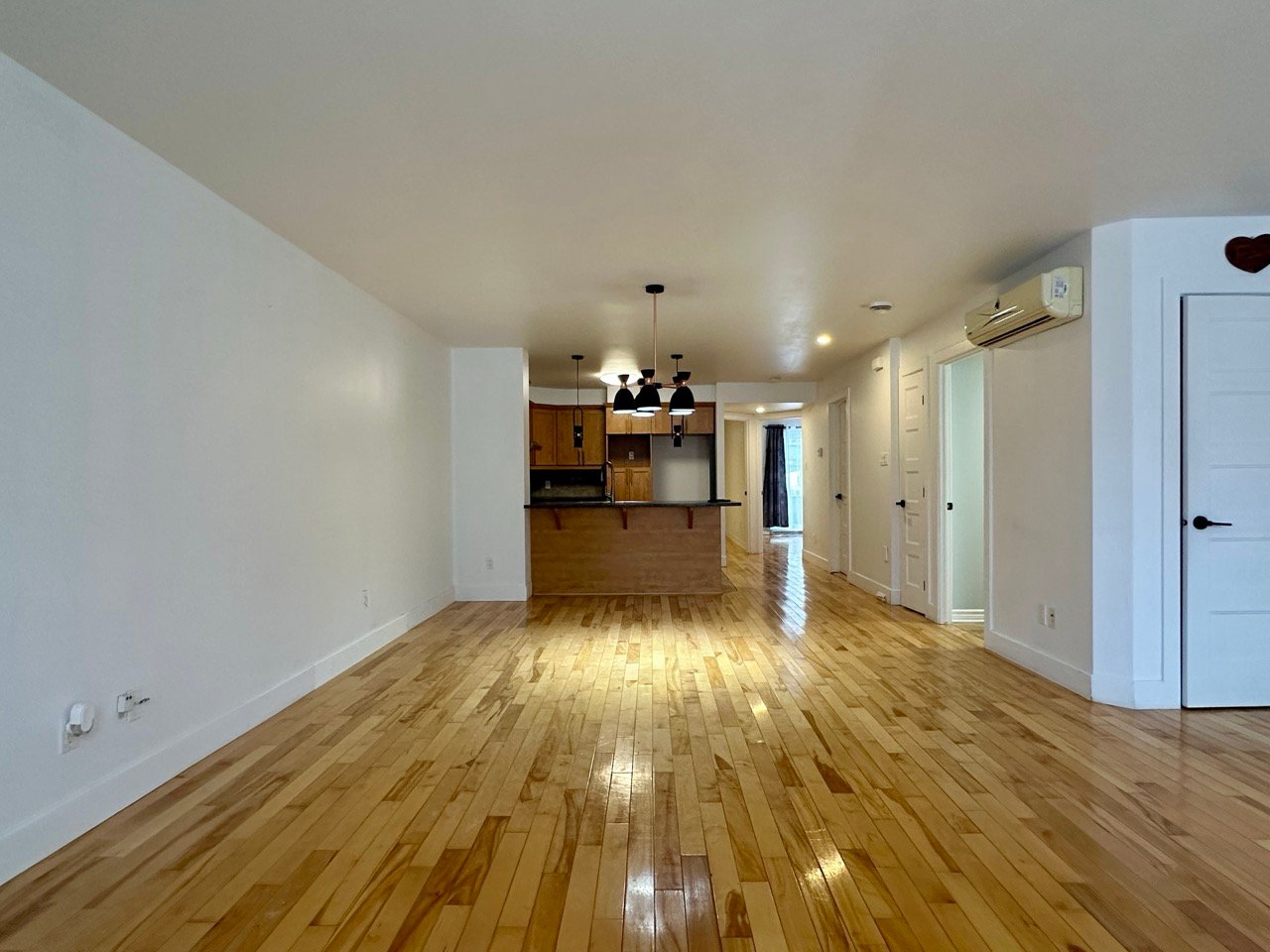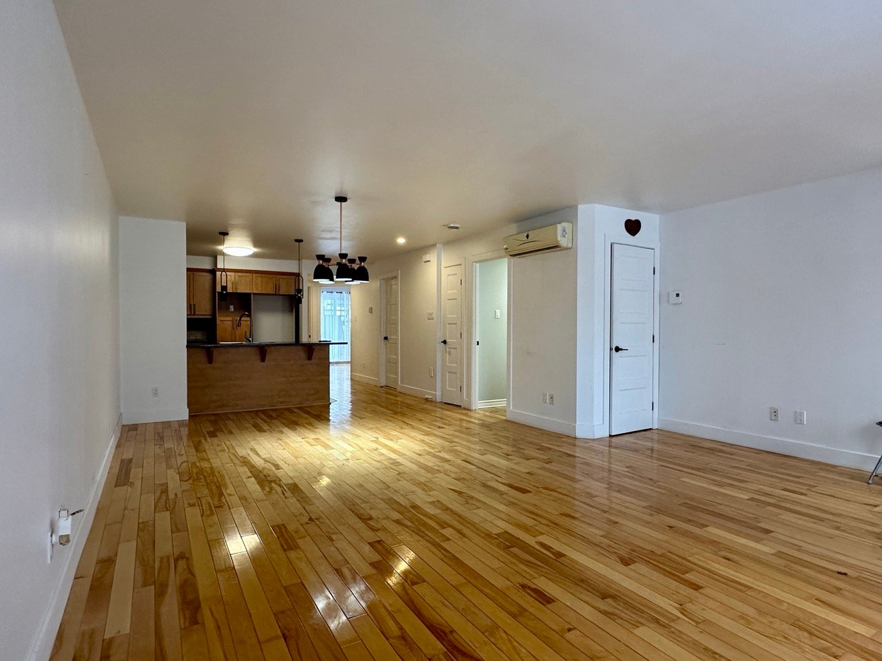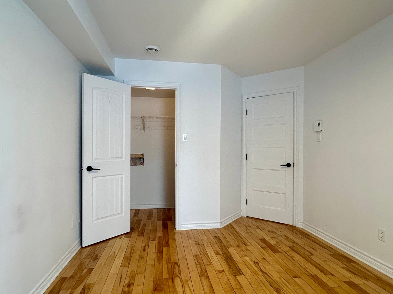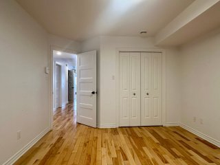 Unfurnished 1,100 sq. ft. condo in Pointe-aux-Trembles featuring a bright open-concept living space with hardwood floors and modern lighting. Functional kitchen with breakfast counter, wood cabinetry, and dishwasher. Separate laundry room. Primary bedroom with walk-in closet and outdoor access, plus a versatile second bedroom. Bathroom with glass shower and podium tub. Large private terrace, storage, and 2 outdoor parking spaces. Wall-mounted A/C and smart thermostats.