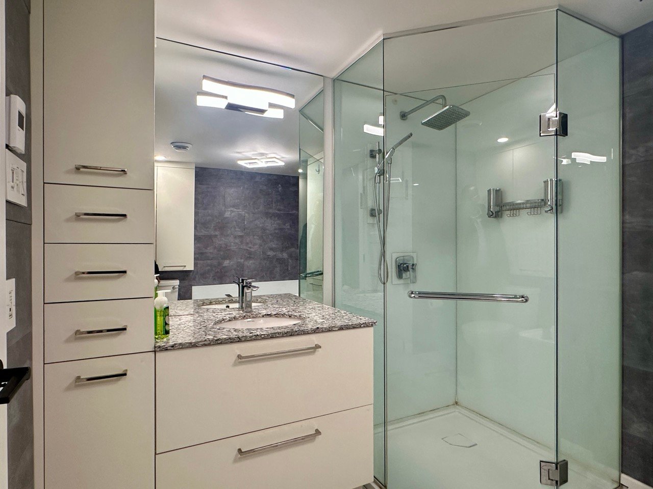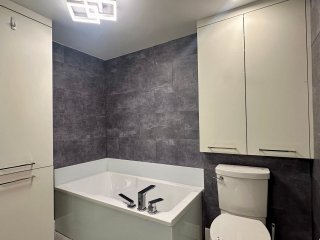 bathtub, and a modern vanity with a stone countertop.